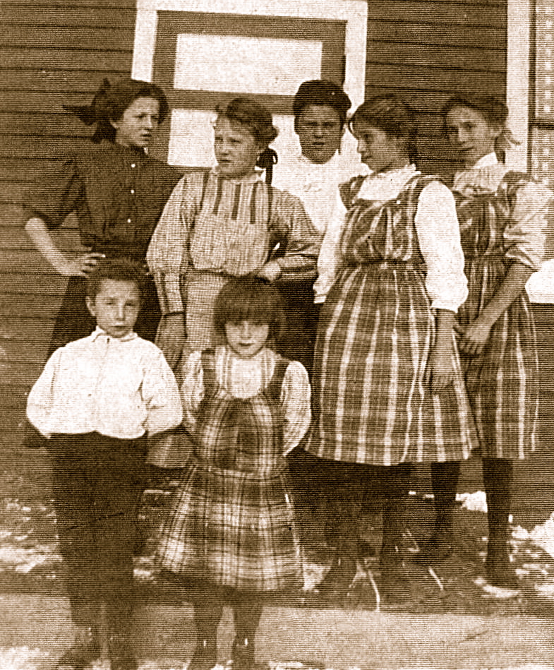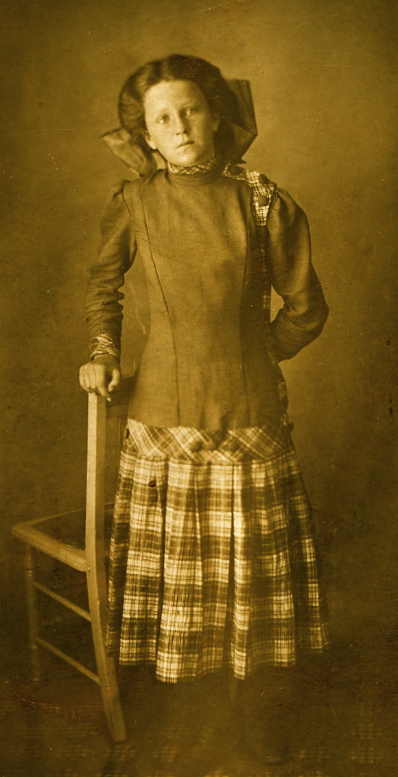 Mary Louise Higgins was the tenth of fourteen children born to Elisha Albion Higgins and Susan Mabel Davis. If my count is correct that makes her the little one covering her eyes.Higgins FamilyShe was born 21 August 1897 in Superior, Wisconsin, her father being a farmer.K A May HigginsBecause she was a smart girl, she soon became the teacher to the area kids.